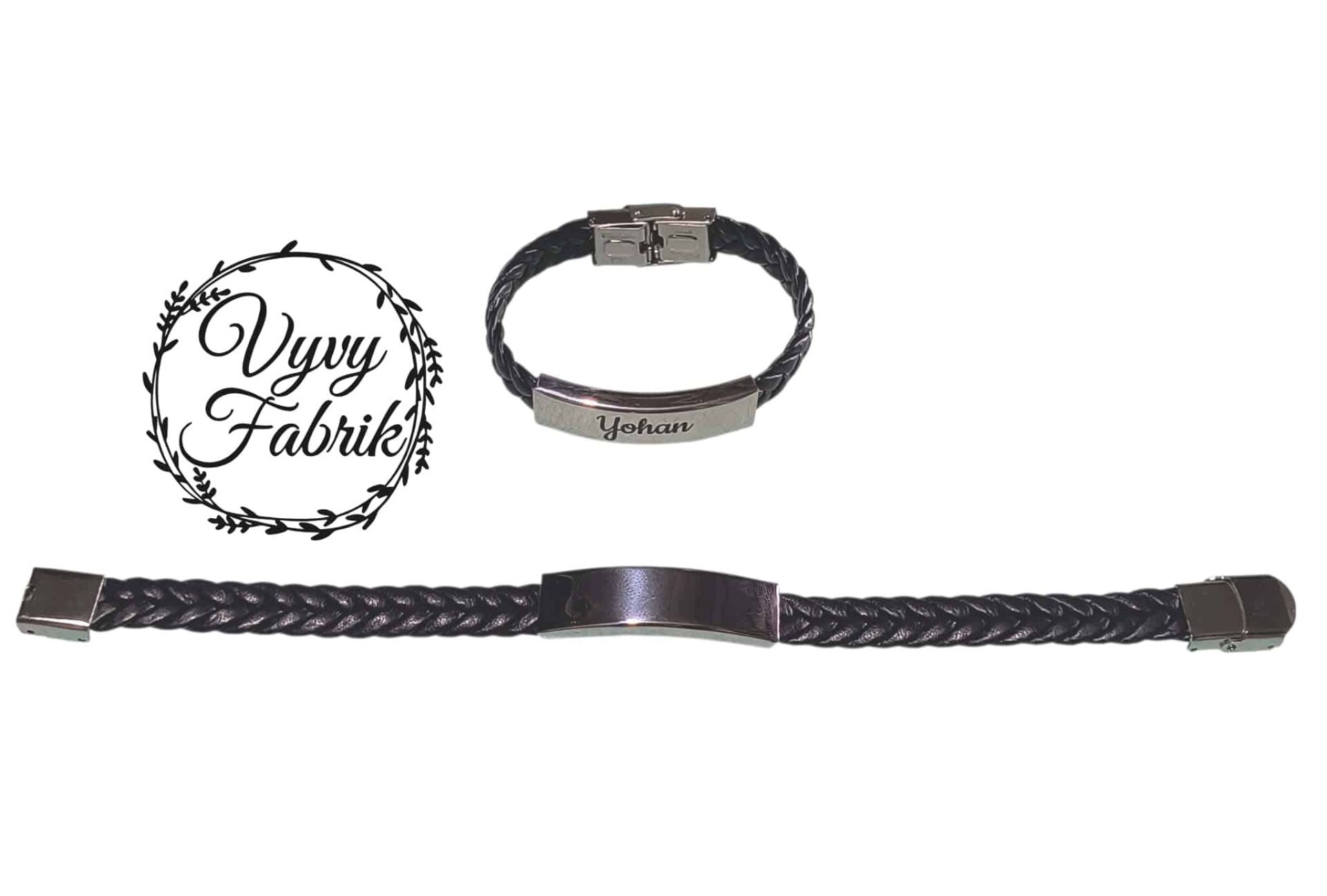 Bracelet homme personnalisé en simili cuir et acier – Gravure laser