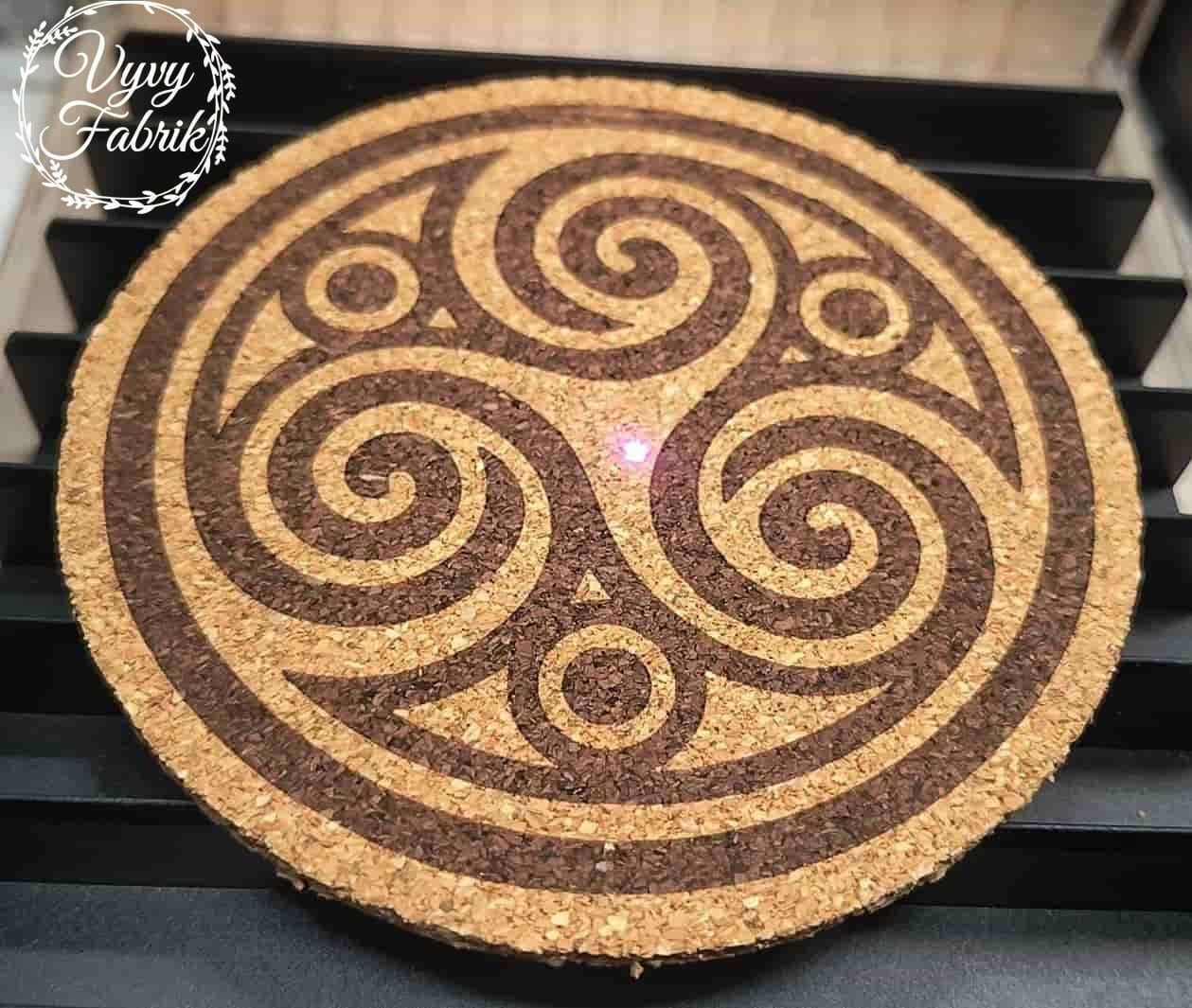 Chaque pièce est gravée avec précision afin d’obtenir un motif net et durable, tout en respectant l’aspect naturel et vivant du liège.